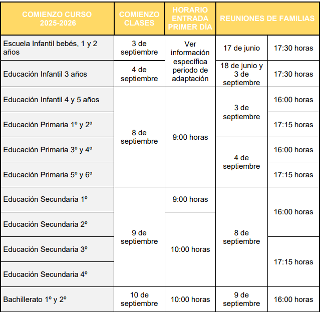 Se os proporcionarán las instrucciones precisas en la reunión de comienzo de curso, si bien la entrada del primer día se realizará en el campo de fútbol para todos los alumnos, que se dirigirán a la zona y cartel que indique su curso (los listados de clase se darán a conocer el día de las reuniones de padres).